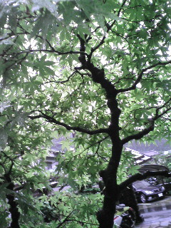 しっぽり濡れた庭のもみじ葉が重なる様子はいとおかしく、おもわず下から見上げるアングルでなめるように撮影してたら、駅までダッシュする羽目に